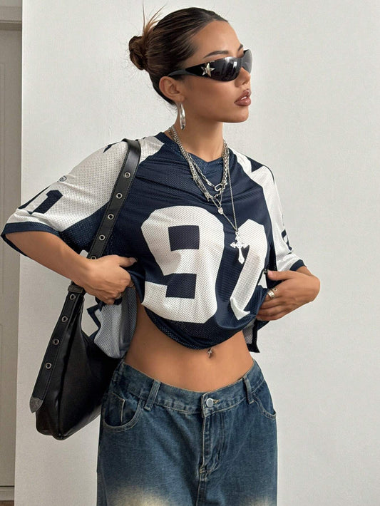 Flirla Breathable Mesh Color Block Numeric Print Loose Fit T-Shirt, Spring/Summer Graphic Tees Women Tops